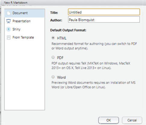 In practice, an R Markdown file (.Rmd) works like a hybrid between a report and a script: it contains written text (like a Word document) and chunks of code (like an R script). When you compile (“knit”) the file, R executes the code chunks and inserts the results (tables, plots, numbers) directly into the final report.