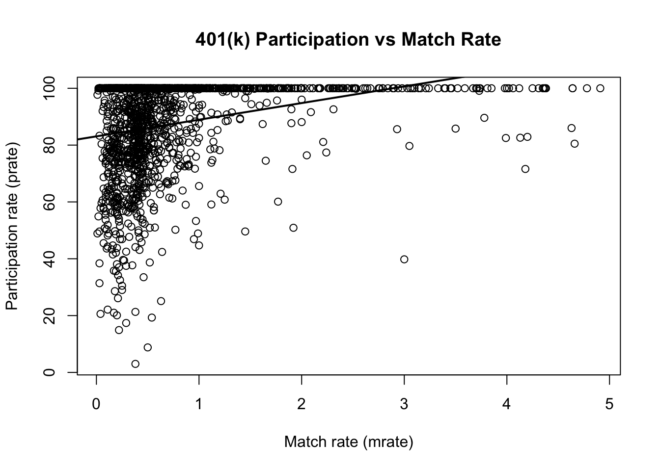 This notebook reproduces Wooldridge, Computer Exercise C1 (401K). Goal. Use plan-level data to study whether a more generous employer match rate is associated with higher 401(k) participation.